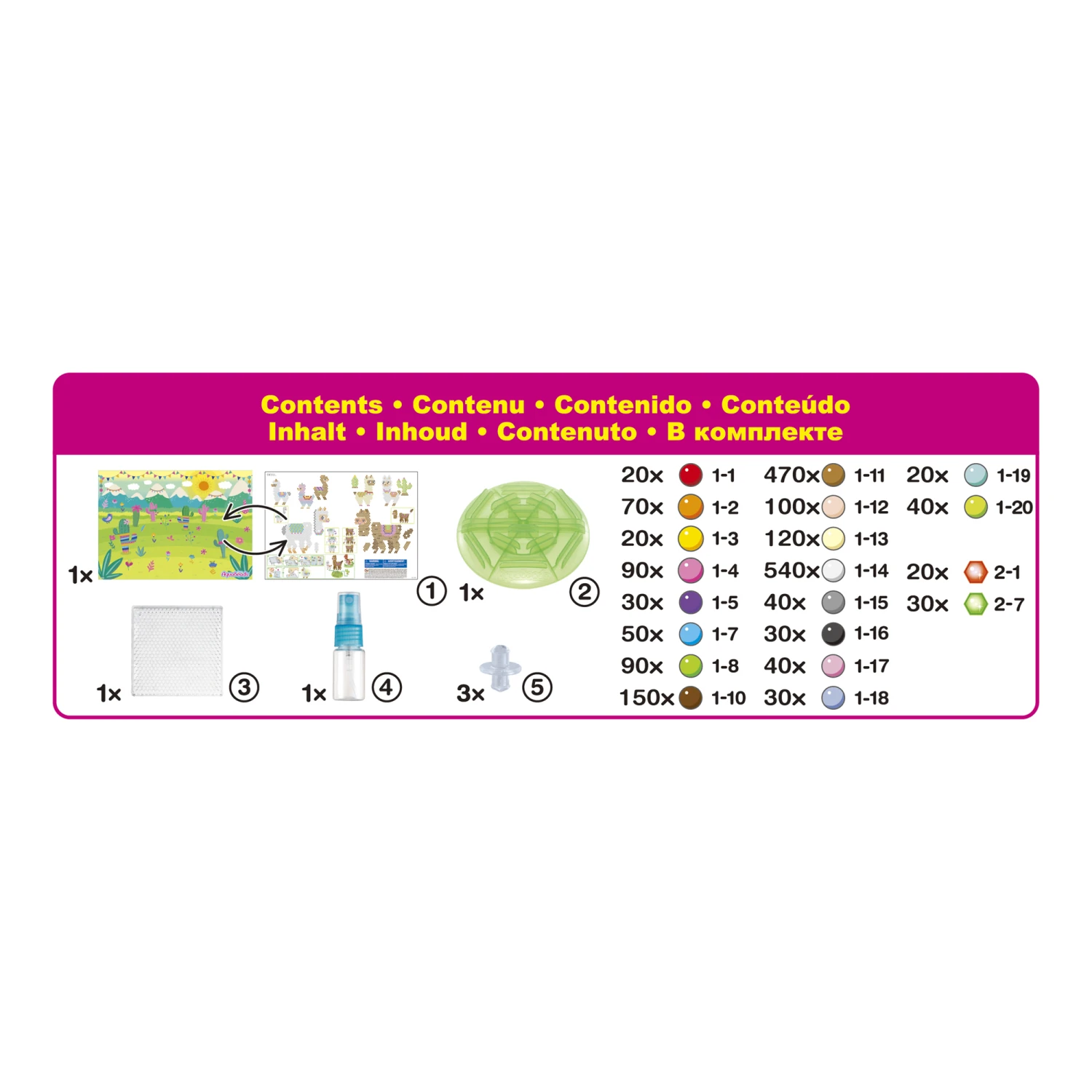 De set bestaat uit 2.000 parels, juweel en klassiek in 20 kleuren, meer dan genoeg om prachtige lieve lama’s te maken! Het bevat een speelmat en een parelstandaard om met je creaties te spelen en verzin prachtige verhalen!