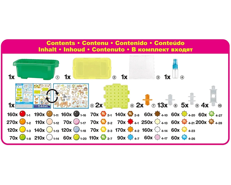 Inhoud: Deze complete kunstzinnige parelset bevat meer dan 3500 parels in 35 kleuren, creatie borden, bevestigingsonderdelen, een legbord, een sproeier, een patroonvel met instructiespatroonvellen bestaande uit paarden, een herdershond, een schaap, een koe, een varken en andere boerderijpatronen gemaakt door de meegeleverde sterrenparels, effen parels en juweelparels op het legbord te plaatsen