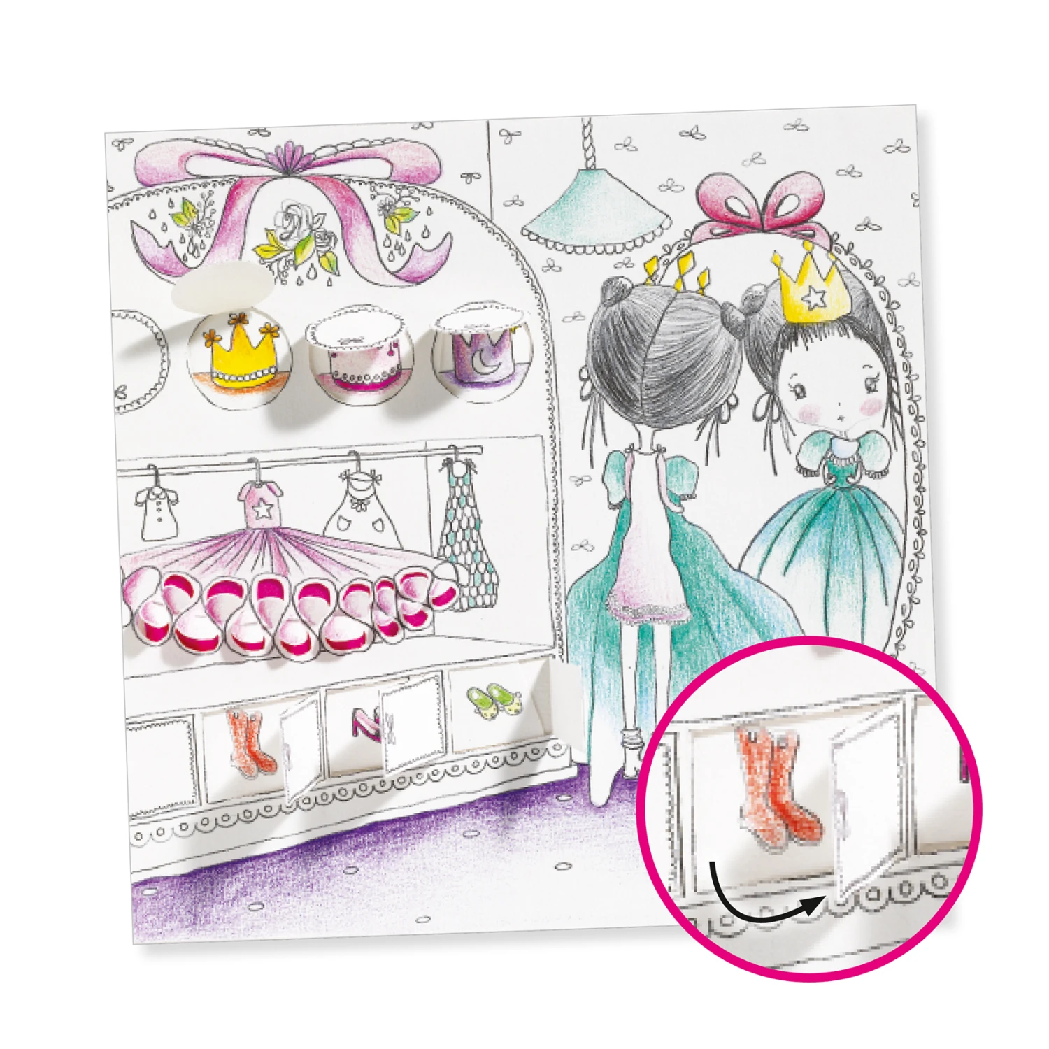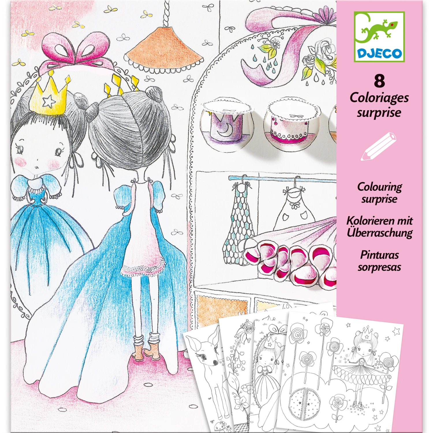 Het kleurpakket bevat 8 geïllustreerde kaarten vol verrassingen om in te kleuren en te onthullen. Wie verstopt zich achter de deuren? Het kind kleurt de kaart in en tilt de kleine flappen op om de verborgen elementen in het decor te ontdekken!