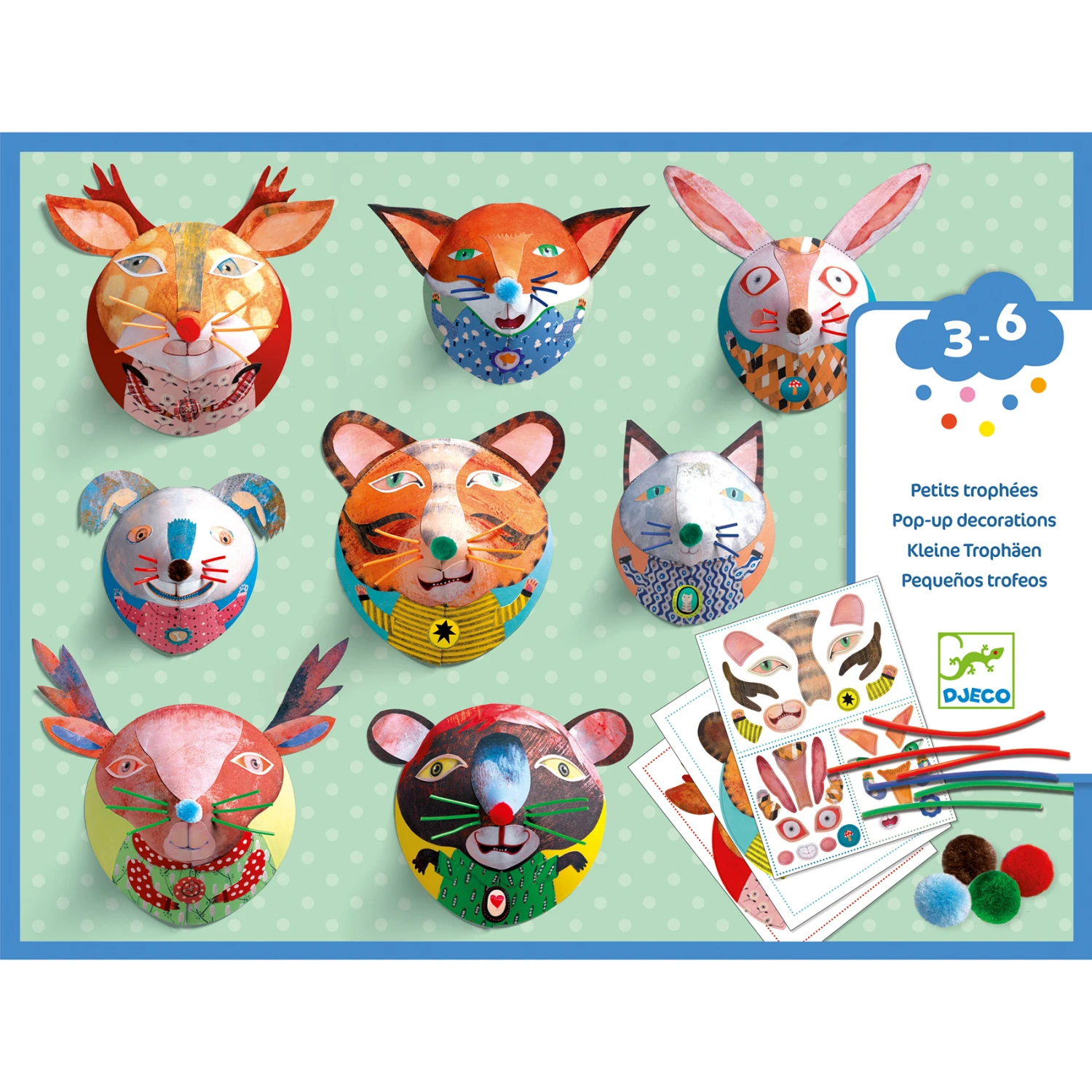 Met dit 3D knutselpakket kun je 8 dierenkoppen maken. De basisportretten worden uit de kaarten gehaald en versierd met de stickers.