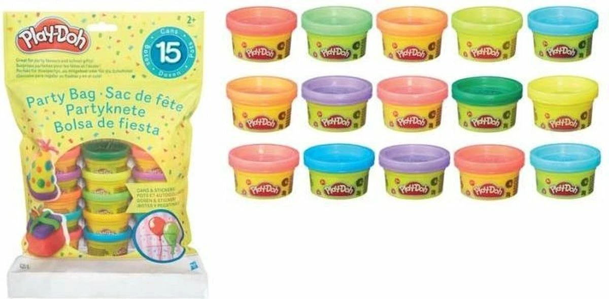 Feestzak met 15 Play-Doh potjes om urenlang te knutselen. Bij elk potje is een feestelijke sticker bijgesloten, om het speelplezier te delen met je vrienden.
