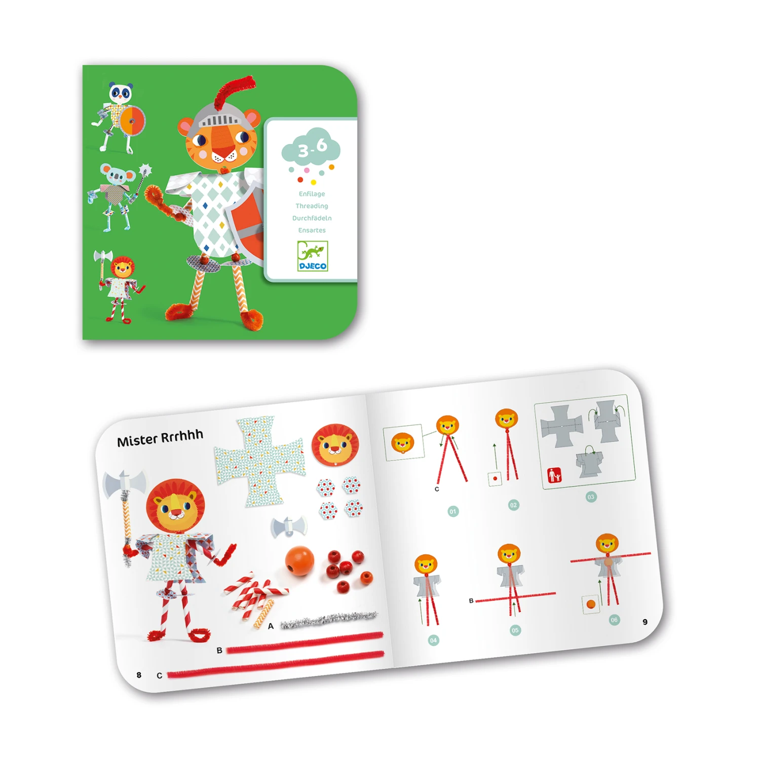 Handvaardigheidsactiviteit van rijgen met chenilledraden. Het kind rijgt houten kralen en geillustreerde kartonnen kokertjes aan chenille draden volgens de instructie in het bijgeleverde boekje.