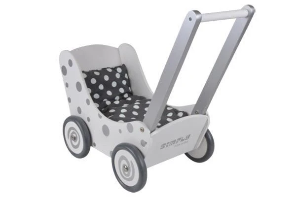 Vrolijke houten poppenwagen, wit met zilveren stippen, inclusief bijpassend poppendekentje. Met duwstang en rubberen wielen.