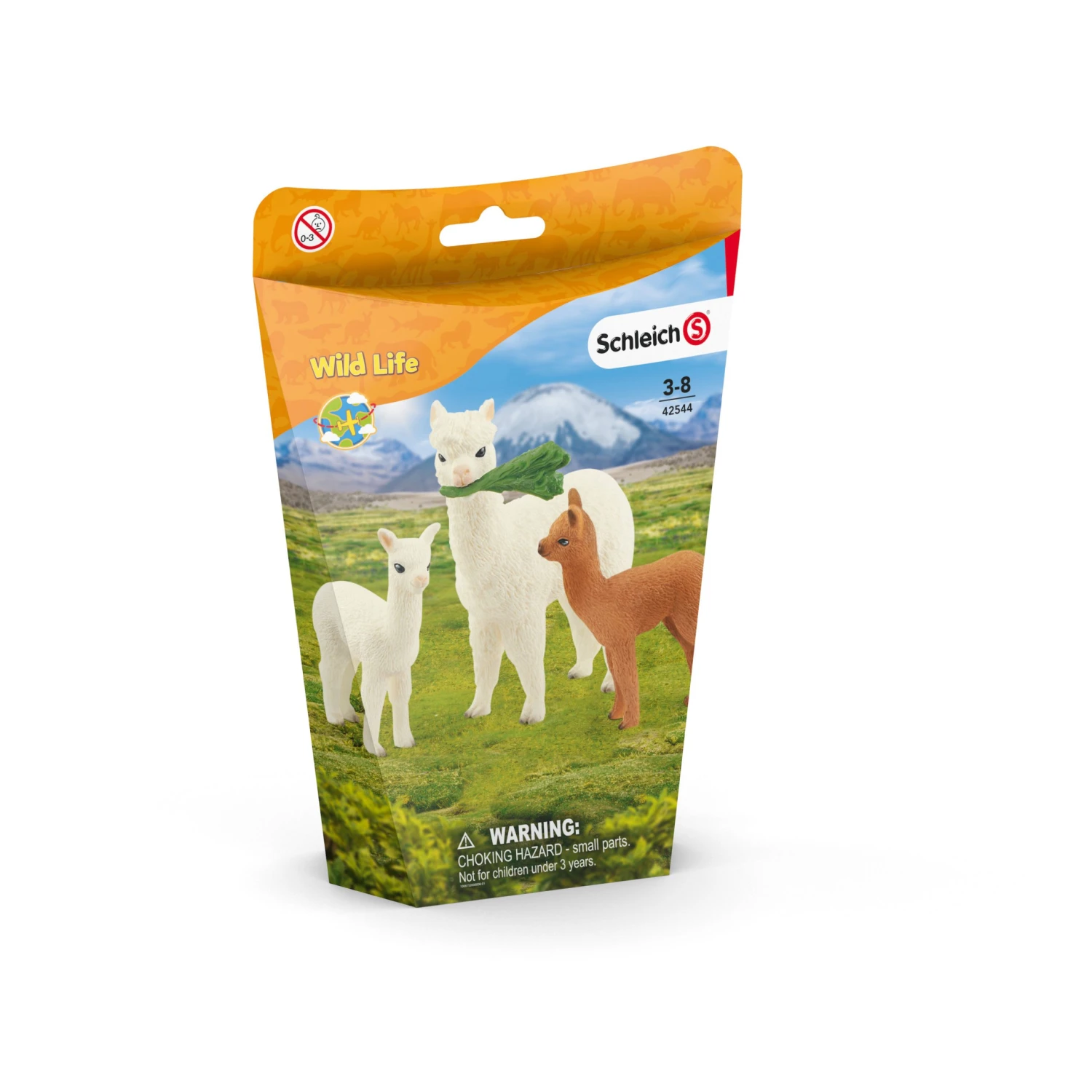 De alpacafamilie van Schleich® WILD LIFE themawereld stamt uit de Andes in Zuid-Amerika, waar de dieren vooral vanwege hun zachte, warme wol worden gefokt. Ze horen tot de bultloze kamelen en hebben een erg rustig en vreedzaam karakter. De beide alpaca veulentjes hebben elk een andere kleur vacht, de ene is wit en de andere is bruin. Ze drinken ongeveer 6-8 maanden bij de moeder, voordat ze gras beginnen te eten.