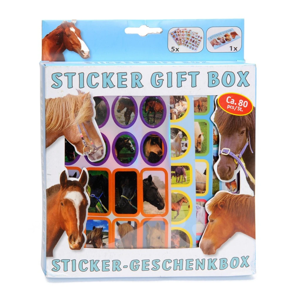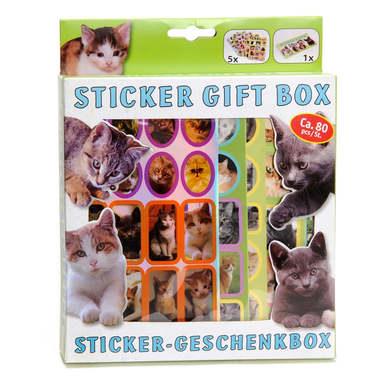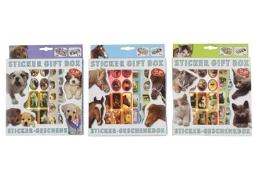 Geschenkdoos met een veelheid aan stickers in verschillende vormen en maten met 3 verschillende dieren thema’s.