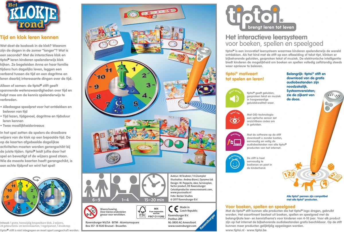 - Twee moeilijkheidsniveaus. In het spel zetten de spelers de draaibare wijzers van de klok op een bepaalde tijd. De op de kaarten afgebeelde dagelijkse activiteiten moeten worden gerangschikt bij de juiste tijden. Tiptoi leidt je door het spel en bevestigt of de wijzers goed staan.